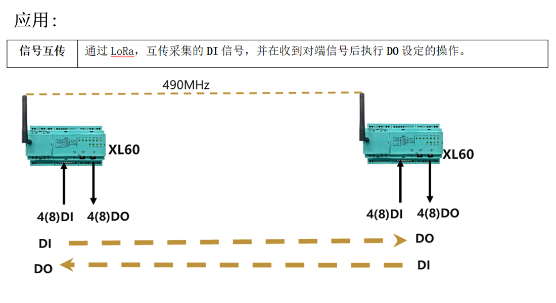 無線開關量對傳模塊XL60D,由一對XL60D采集模塊組成,從一端模塊輸入的開關信號,無線對傳到另一端輸出開關信號。開關信號是一對一的輸入、輸出,DO隨著對應DI的變化而變化。