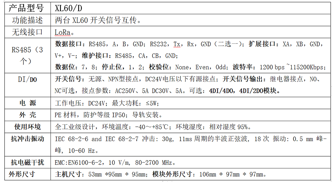 XL60D的通信方式是LoRa無線傳輸方式,每臺XL60D主機模塊,最多配兩個開關量I/O模塊。