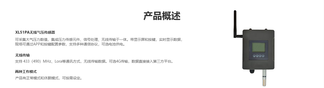 XL51PA無線氣壓傳感器,可采集大氣壓力數值,集成壓力傳感元件、信號處理、無線傳輸于一體。帶顯示屏和按鍵,實時顯示數據,現場可通過APP和按鍵配置參數,支持多種通信協議。