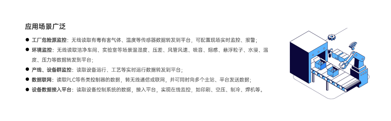 工廠危險源監控,無線讀取有毒有害氣體、溫度等數據轉發到平臺,可配置現場實時監控、報警;