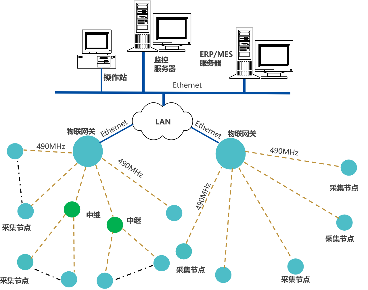 采集節點數據,通過LoRa上傳數據至物聯網關,網關通過Ethernet或Wi-Fi,接入LAN,推送數據至企業生產管控服務器