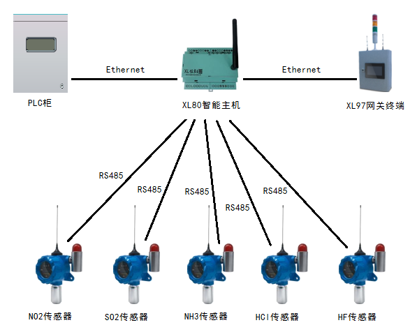我司廢氣監(jiān)測系統(tǒng),選用XL97網(wǎng)關(guān)終端。通過采用RS485線的方式將各監(jiān)測點(diǎn)的數(shù)據(jù)傳輸至XL80智能主機(jī),智能主機(jī)的一個網(wǎng)口通過ETHERNET方式將數(shù)據(jù)轉(zhuǎn)發(fā)給原有PLC系統(tǒng);另一網(wǎng)口通過ETHERNET方式將數(shù)據(jù)上傳至XL97網(wǎng)關(guān)終端,網(wǎng)關(guān)終端將傳來的數(shù)據(jù)進(jìn)行分析處理后,直觀的將各監(jiān)測點(diǎn)的數(shù)據(jù)實時顯示出來。