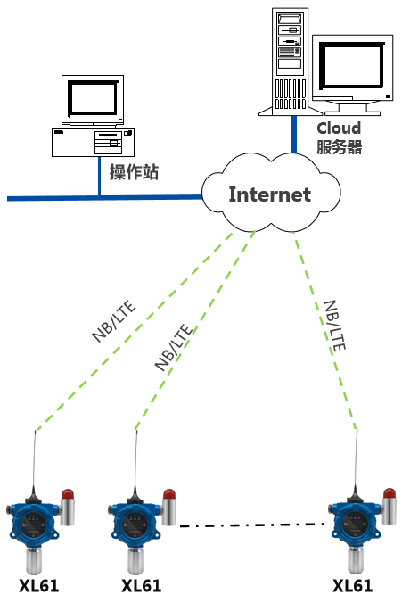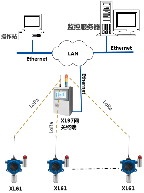 4、如增加現(xiàn)場集中監(jiān)控點,可配置XL97網(wǎng)關終端,讀取區(qū)域內XL61上傳的數(shù)據(jù),分析處理、顯示、報警,并轉發(fā)至監(jiān)控中心服務器。
