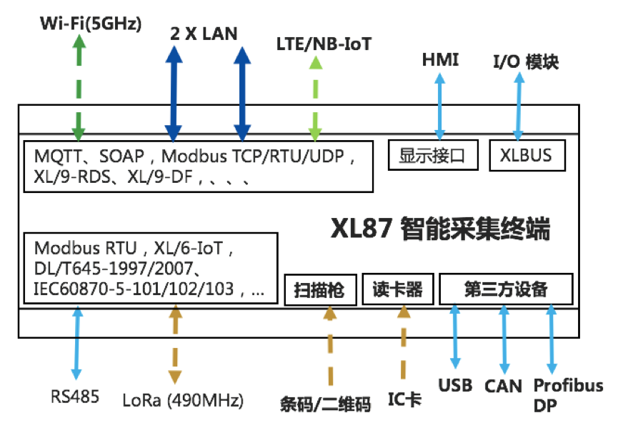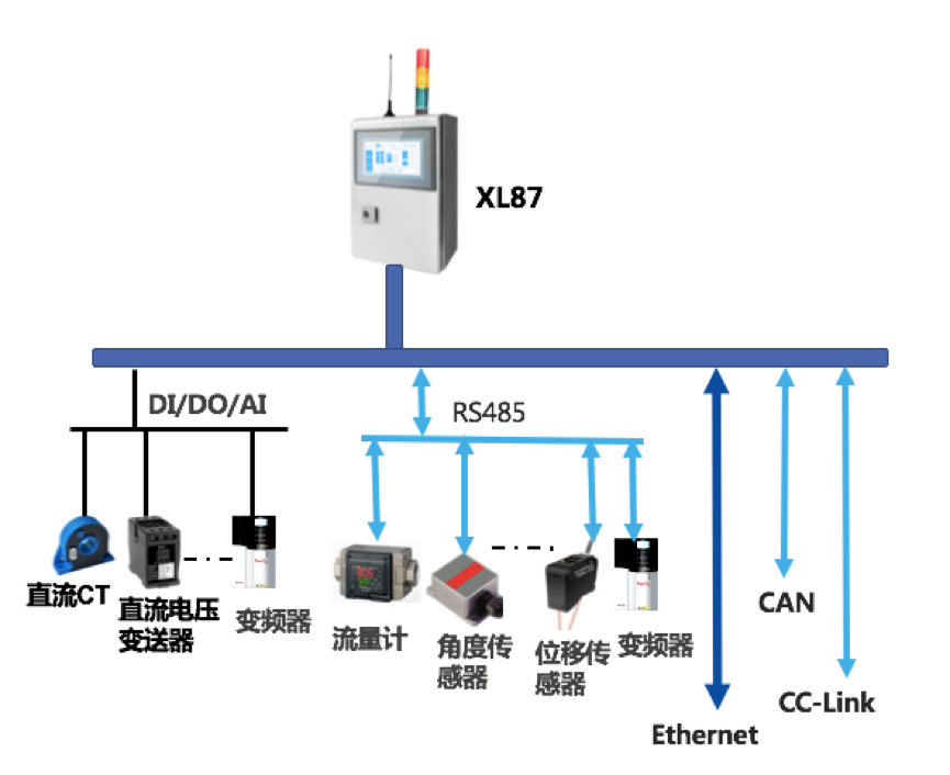 XL87智能采集終端,配置有 DI/AI/DO/AO,Ethernet,LoRa(無線),RS485、CAN、USB等等接口,通過各種功能的傳感器,采集設備運行工藝數據;