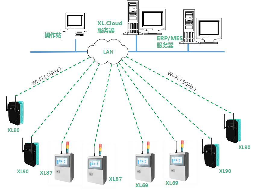 平臺系統的通信網絡,由XL90物聯網關,企業局域網,和監控服務器構成。