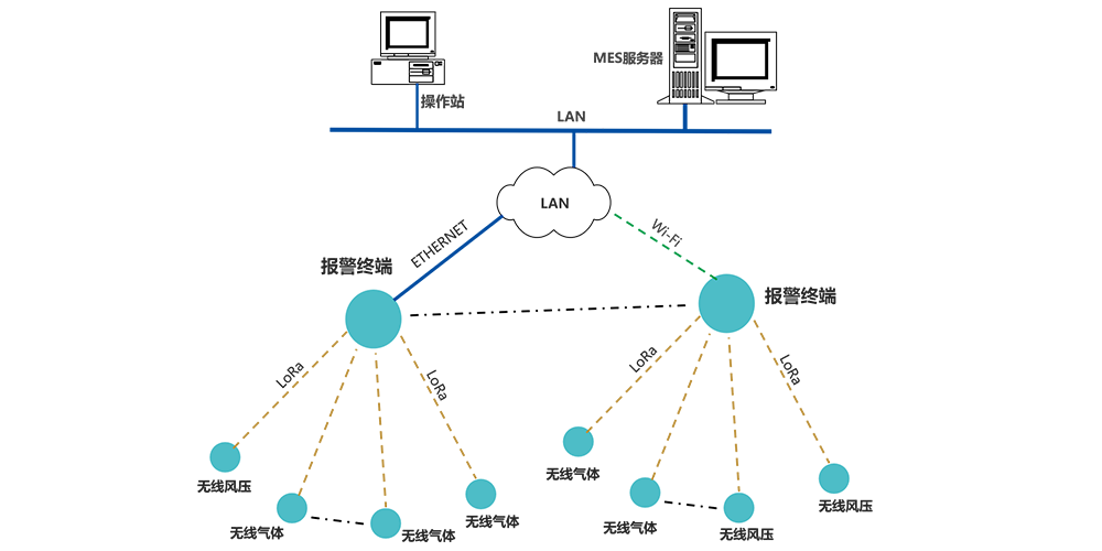 報警終端無線讀取監測點上傳的數據,進行處理、顯示、報警;并將數據通過局域網,MQTT協議,上傳至MES。