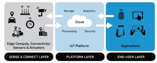 物聯(lián)網(wǎng)大致分為3 層。第1 層為感知和連接層,用于將物聯(lián)網(wǎng)硬件連接到執(zhí)行數(shù)據(jù)處理和存儲的網(wǎng)絡(luò)應(yīng)用。第2 層為平臺層,用于保護(hù)、處理、分析和存儲數(shù)據(jù)。第3層為最終用戶層,最終用戶在此使用應(yīng)用監(jiān)控并解讀數(shù)據(jù)。此外,最終用戶還可以使用應(yīng)用發(fā)送指令。