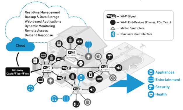 Matter有助于消費(fèi)類物聯(lián)網(wǎng)互聯(lián)生態(tài)系統(tǒng)輕松實(shí)現(xiàn)即插即用,從而簡化智能家居和智能辦公環(huán)境。它在互聯(lián)網(wǎng)協(xié)議之上提供一個(gè)層,其中包括一組適用于所有Matter連接設(shè)備的預(yù)定義方案。這使得 Matter 設(shè)備能夠了解它們正在與什么類型的對象進(jìn)行通信,以及這些對象有什么樣的功能。Matter 使物聯(lián)網(wǎng)終端設(shè)備或節(jié)點(diǎn)能夠與各種 Wi-Fi 網(wǎng)絡(luò) pod 輕松通信。