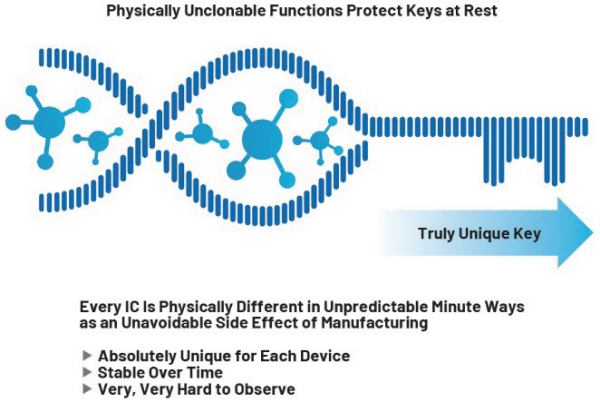 不幸的是,由于直接探測會試圖監視微電路的內部結構,因此通用微控制器中常用的存儲器技術(即 EEPROM或閃存)并不安全。利用掃描電子顯微鏡(SEM),攻擊者無需很高成本,即可直接監視存儲器的內容。為了降低此風險,半導體行業開發了“物理不可克隆功能”(PUF) 技術。PUF 用來從微電路的固有物理屬性中導出唯一密鑰。這些因芯片而異的屬性很難直接探測,因此難以通過直接探測提取生成的密鑰。在一些情況下,PUF派生密鑰會對信任根內部存儲器的其余部分進行加密,從而保護設備上存儲的所有其他密鑰和憑據。