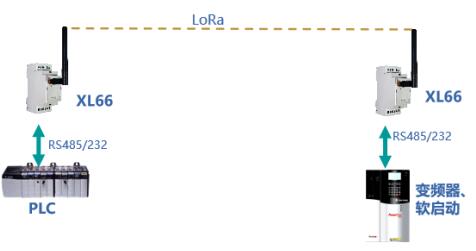 將一對XL66分別與兩臺有RS485/232通信口的設(shè)備連接,實(shí)現(xiàn)這兩臺串口設(shè)備的無線連接、通信。