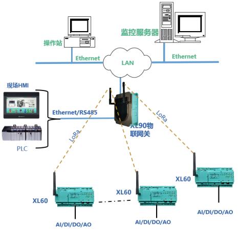 方案一:XL60無線采集裝置采集的現場設備數據,采用LoRa無線傳輸方式,傳輸至XL90物聯網關,經協議轉換后將數據通過EthernetRS485上傳至監控平臺、PLC、觸摸屏、控制器等設備。