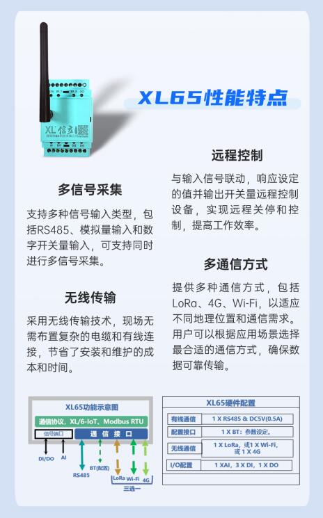 設備選型:選擇XL65無線采集器,配置DIAI、RS485等輸入,從機器設備上采集狀態信號,從而獲取基礎數據;并配DO輸出,可下發控制、通知、呼喚等信號。