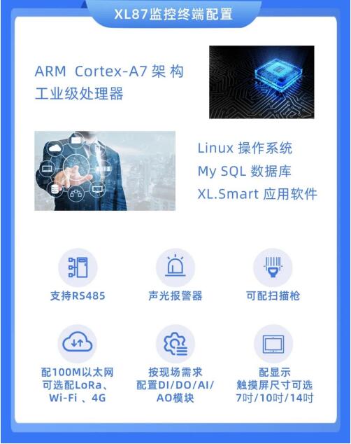 設備選型:選擇XL87監控終端,搭配相應技術參數的傳感器、流量計、水表計量裝置等,可實現對上述生產數據的采集,進而分析、判斷、追溯產品質量,判斷設備效率、運行經濟性等指標。