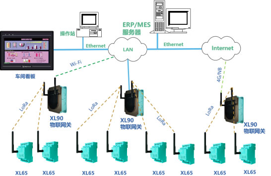XL65無線采集器,通過LoRa無線通訊上傳數據至XL906物聯網關,網關通過Ethernet、Wi-Fi4G,推送數據至監管平臺或企業生產管控服務器。