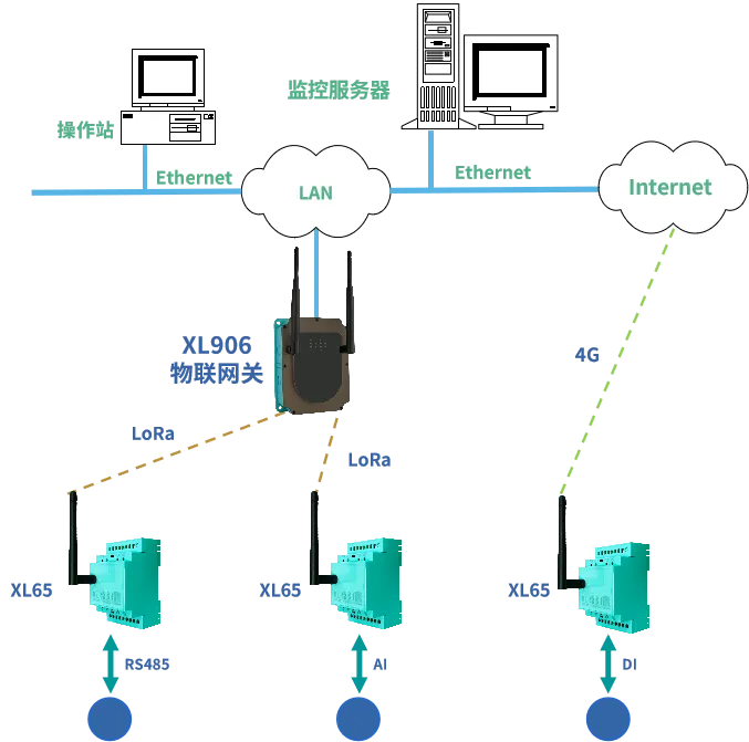 LoRa通信:適合多個監測點處于相對集中的區域范圍內,監測點數據通過LoRa上傳至XL90物聯網關,網關通過Ethernet、WiFi、4G等通信方式上傳數據至監控平臺;