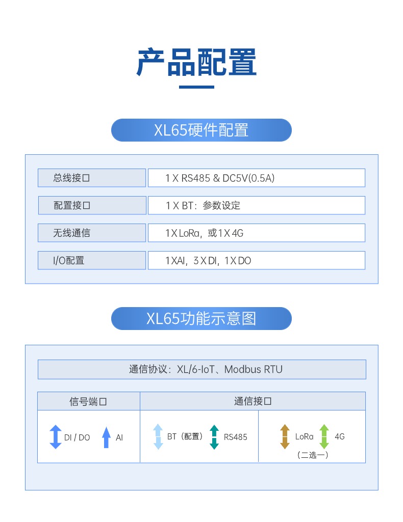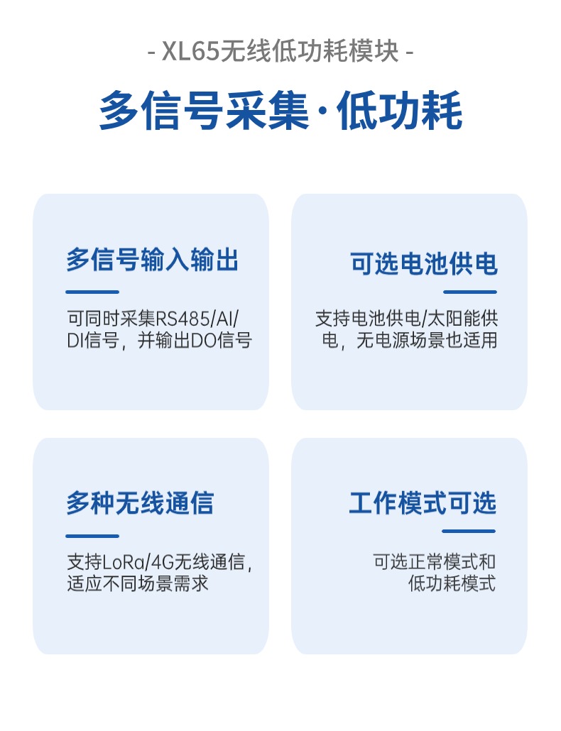 XL65無線低功耗模塊,集成RS485通信口和豐富的I/0口,可實現同時采集1路AI信號、3路DI信號、1路RS485信號,支持多種無線通信方式上傳采集的信號和數據??蛇x電池供電,適用于更多供電不便的場景。