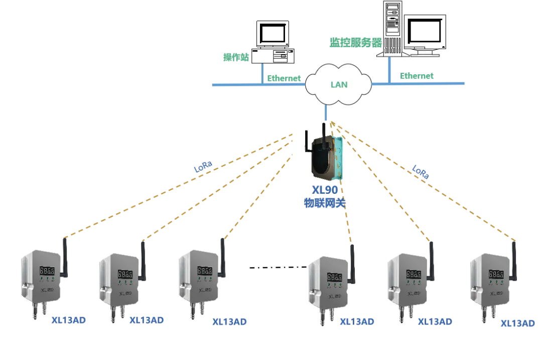 XL13AD無線壓差傳感器通過LoRa無線傳輸數(shù)據(jù)至XL906物聯(lián)網(wǎng)關,網(wǎng)關可選Ethernet、Wi-Fi、4G等多種方式將壓差數(shù)據(jù)傳輸至監(jiān)控平臺,實現(xiàn)遠程監(jiān)測。